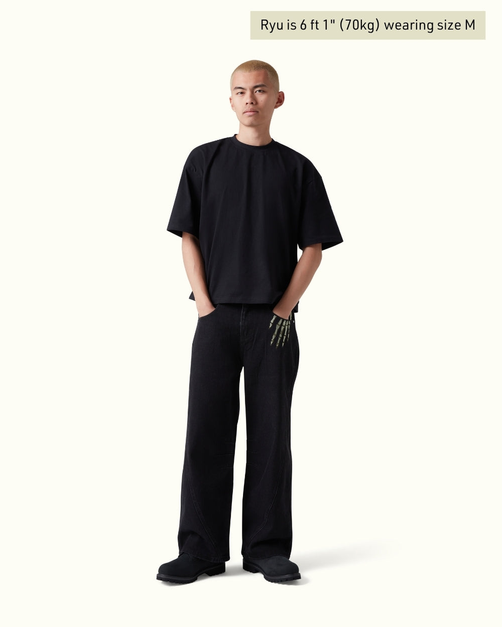 Jet-black denim subtly faded for a worn-in look. The front left pocket carries an intricate skeleton hand embroidery. The back features dual pocket embroidery inspired by Van Gogh and spells ‘Vescartes’ in the drifting smoke. Finished with custom front and back panel construction and our signature metal hardware.